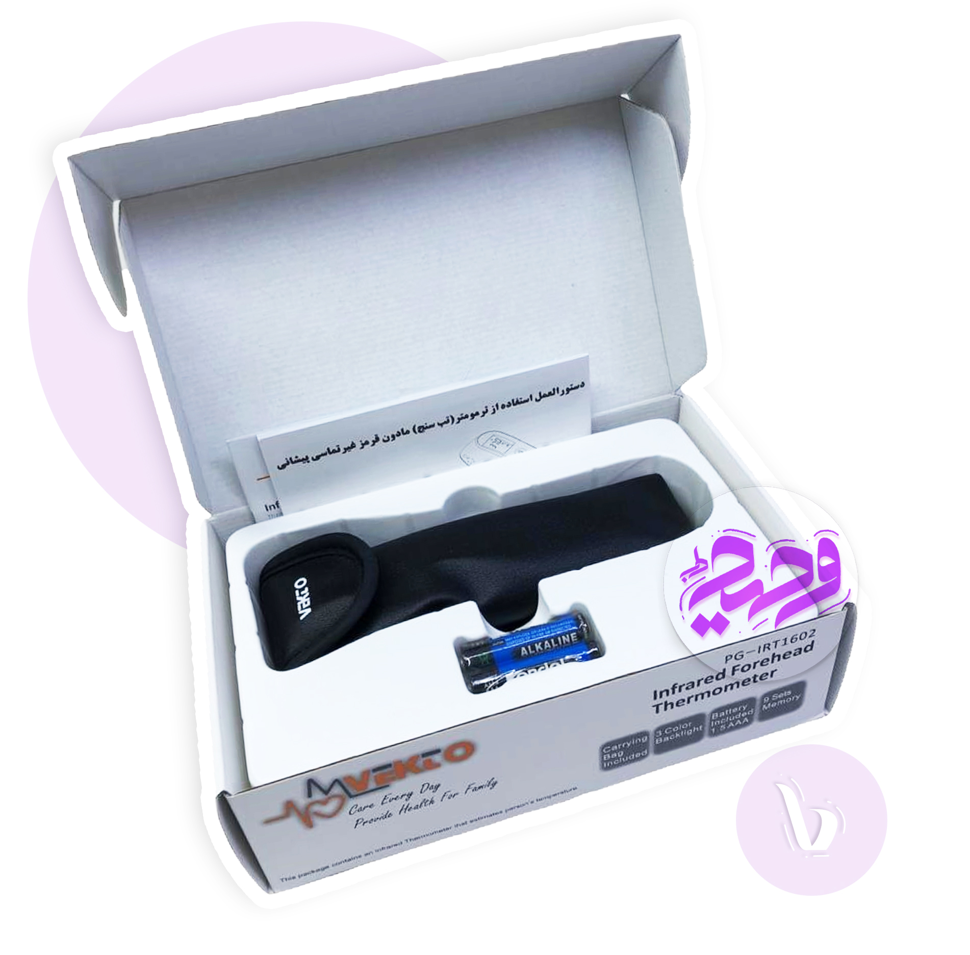 قابلیت اندازه گیری دمای بدن بدون تماس دارای صفحه نمایش دیجیتال با سه رنگ نور پس زمینه دارای 9 سری حافظه دارای دو واحد اندازه گیری سانتی گراد و فارنهایت اندازه گیری دما در کمتر از 1 ثانیه طراحی ساده و مقرون به صرفه امکان روشن و خاموش کردن صدای دستگاه خاموشی خودکار پس از 30 ثانیه بدون استفاده ماندن دارای هشدار بالا بودن تب بدن به صورت صوتی و نوری دارای کیف چرمی برای حمل آسان منبع تغذیه : دوعدد باطری نیم قلمی دارای مجوز وزارت بهداشت دارای یکسال گارانتی شرکت وکتو