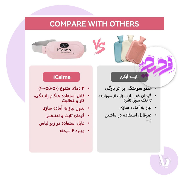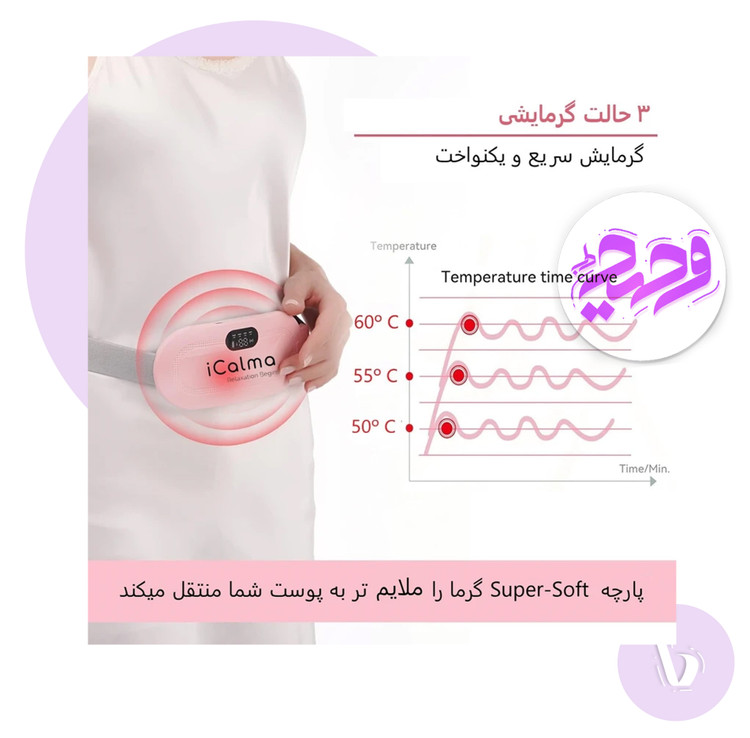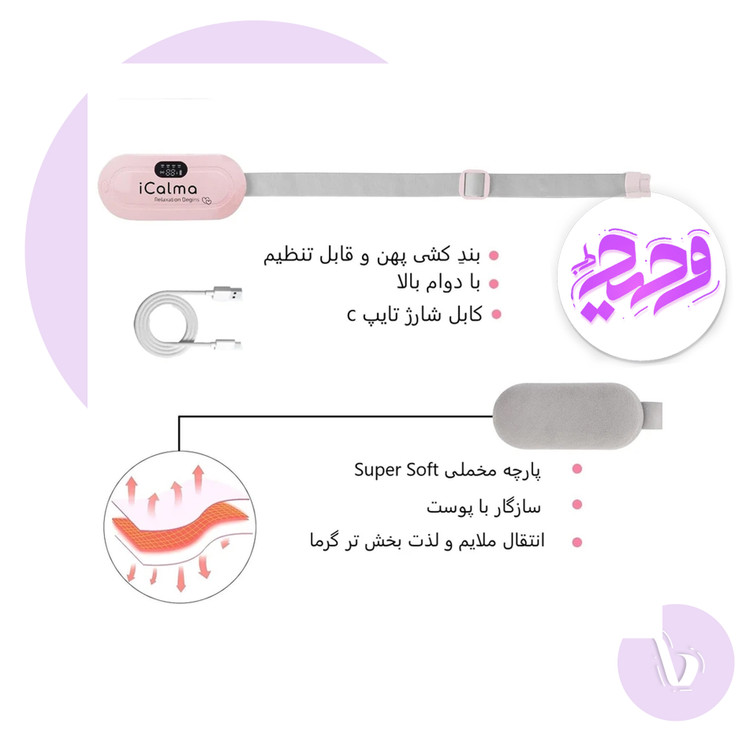 کمربند حرارتی iCalma با سه حالت دمایی 50، 55 و 60 درجه سانتی گراد، گرمای یکنواخت و بسیار مطبوعی را برای شما ایجاد میکند. برخلاف کیسه آبگرم که دمای آن از حالت جوش به سرد همواره در حال تغییر است. کمربند iCalma به راحتی در دسترس است و سریع گرم میشود. نیاز به جوش آوردن آب و آمادگی خاصی نیست. همچنین خطرات سوختگی بر اثر آب جوش را ندارد. دارای کش پَهن و قابل تنظیم است که به شما اجازه میدهد در هر حالتی قابل استفاده باشد! برخلاف کیسه آبگرم که فقط هنگام استراحت قابل استفاده است و اجازه تحرک نمیدهد. در زمستان بعنوان گرم کن شکم و پهلوها نیز قابل استفاده است. علاوه بر گرم کردن شکم، برای کمر نیز مناسب است. باتری 1800 میلی آمپری این کمربند با 2 الی 3 ساعت شارژ، فول شارژ میشود و برای استفاده به مدت حدودا 1.5 ساعت با بیشترین درجه حرارت کافی ست. شارژ توسط کابل type-C انجام میشود که در بسته بندی نیز وجود دارد. پشت این کمربند گرم کننده، از پارچه مخملی super-soft استفاده شده که بسیار لطیف است و حس خوبی را هنگام تماس با بدن منتقل کند